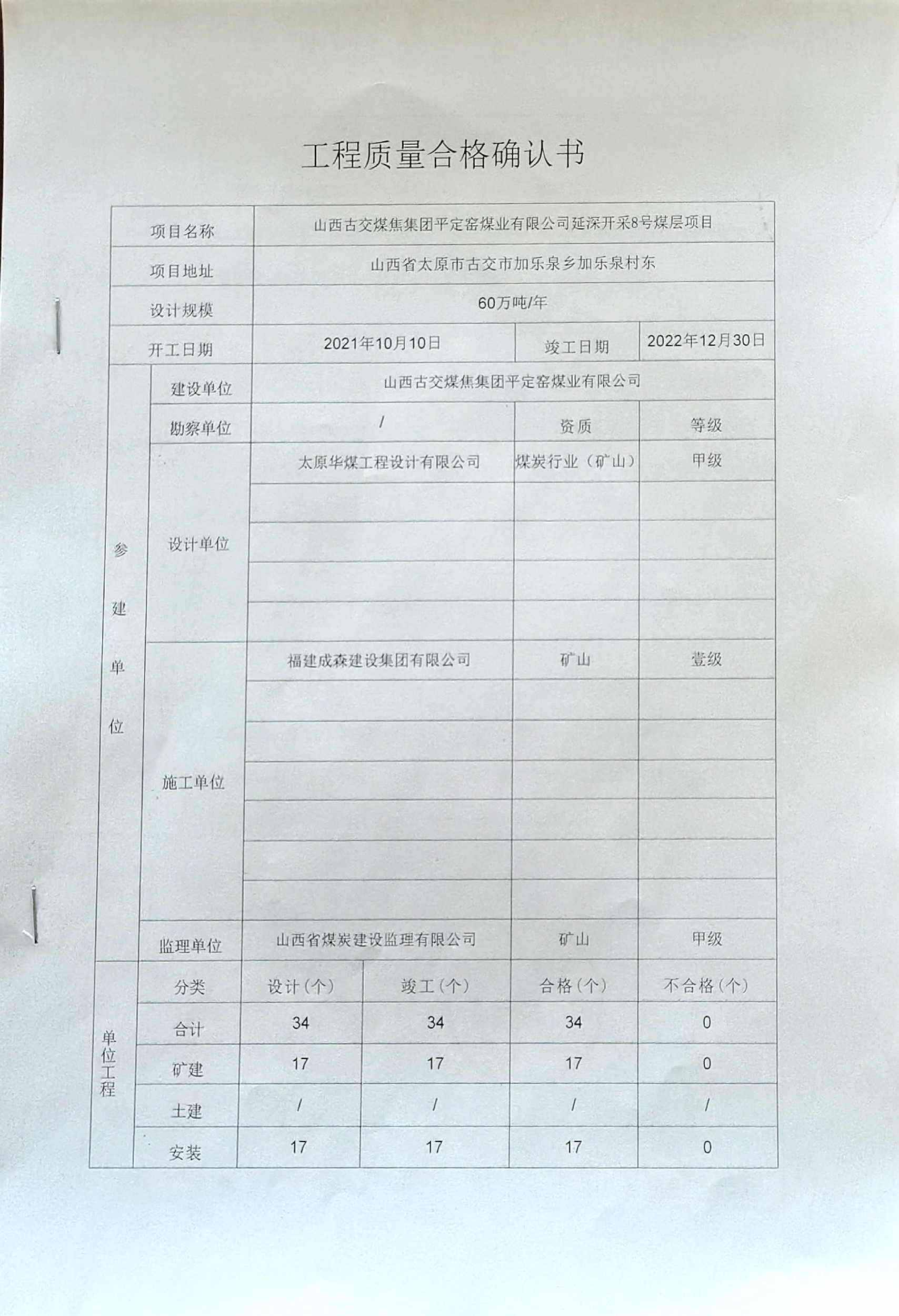 山西古交煤焦集團(tuán)平定窯煤業(yè)有限公司延深開采8號(hào)煤層項(xiàng)目工程質(zhì)量合格確認(rèn)書